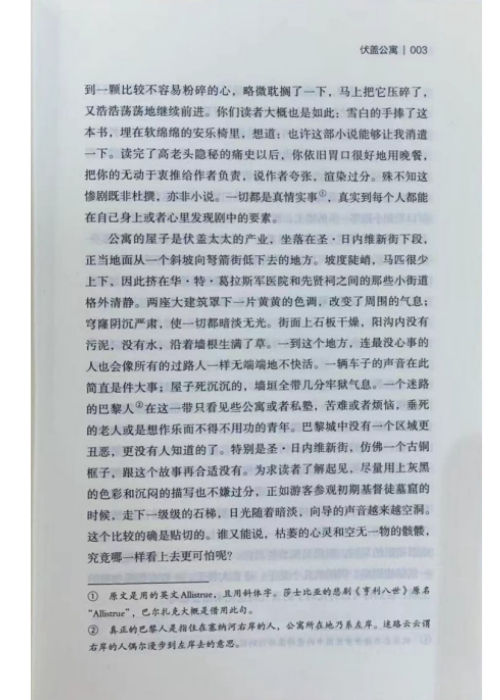 公寓的屋子是伏盖太太的产业,坐落在圣·日内维新街下段正当地面从一个斜坡向弩箭街低下去的地方。坡度陡峭,马匹很少上下,因此挤在华·特·葛拉斯军医院和先贤祠之间的那些小街道格外清静。两座大建筑罩下一片黄黄的色调,改变了周围的气息;穹隆阴沉严肃,使一切都暗淡无光。街面上石板干燥,阳沟内没有污泥,没有水,沿着墙根生满了草。一到这个地方,连最没心事的人也会像所有的过路人一样无端端地不快活。一辆车子的声音在此简直是件大事;屋子死沉沉的,墙垣全带几分牢狱气息。一个迷路的巴黎人@在这一带只看见些公寓或者私塾,苦难或者烦恼,垂死的老人或是想作乐而不得不用功的青年。巴黎城中没有一个区域更丑恶,更没有人知道的了。特别是圣·日内维新街,仿佛一个古铜框子,跟这个故事再合适没有。为求读者了解起见,尽量用上灰黑的色彩和沉闷的描写也不嫌过分,正如游客参观初期基督徒墓窟的时候,走下一级级的石梯,日光随着暗淡,向导的声音越来越空洞。这个比较的确是贴切的。谁又能说,枯萎的心灵和空无一物的骸骸究竞哪一样看上去更可怕呢?
