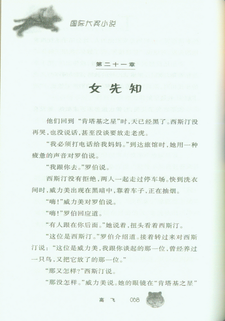 罗伯知道找到老虎是种好运。今天早上,他一直在“肯塔基之星”汽车旅馆后面的森林里闲晃,倒不是真心想找什么东西,只是希望自己会迷路,或者被熊吃了,从此不用再上学。就在那个时候,他见到那座老旧的、钉满木板、摇摇欲坠的博向波加油站旁边有个笼子。不可思议的是,笼子里竟然有只老虎——一只来回走动、活生生的大老虎!它全身覆盖着橘色和金色的皮毛,颜色非常鲜艳,就像披着阳光一般,气腾腾地被困在笼子里。