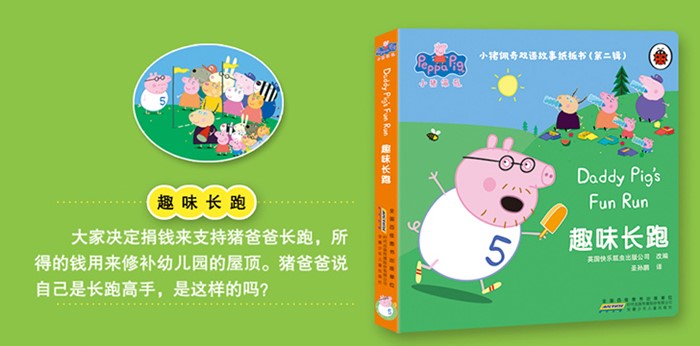 1.本套书为继《小猪佩奇双语故事纸板书》之后,为低年龄段儿童打造中英双语纸板书,分别是《自行车比赛》《佩奇打篮球》《体育课》《佩奇去滑冰》《趣味长跑》。每本书分别讲述了一个关于运动的小故事,幽默欢快,当城市生活、电子产品逐渐成为孩子们生活的主要内容时,小猪佩奇带领孩子们体验不同的运动,享受户外清新、健康的空气,回归自然,一起锻炼强健的体魄!