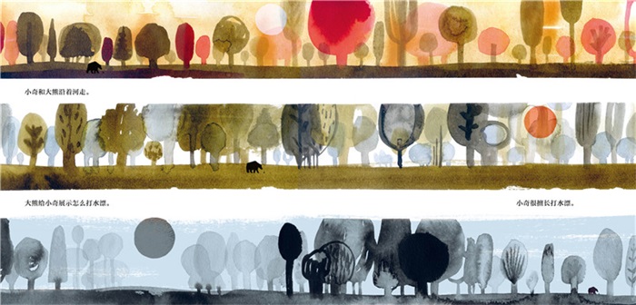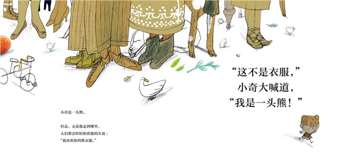 男孩?熊?这可真是一个“傻傻分不清” 的故事。两个“角色错位”的主人公,一段嘀笑皆非的旅程。一个是很渴望变得强大很厉害,但是实际上却是小小只看起来很瘦弱的小男孩,一个是希望能变得很可爱很柔弱,实际却是很威猛很强壮的大熊,他们都希望自己能变成另一个摸样。这样两个主人公相遇一定会带来新鲜的体验和故事。