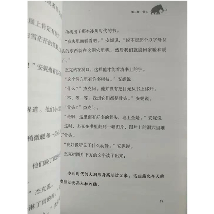 现在,兄妹俩迫不及待地想要出发去寻找剩下的两件东西了。他们乘着神奇树屋来到天寒地冻的冰河时代,误入大洞熊的洞穴,又落入克鲁马努猎人的陷阱。危机时刻,他们被洞穴人的巫师搭救,又被猛犸象帮助。可惜,更大的危险还在后面。冰原霸主剑齿虎正在步步逼近……