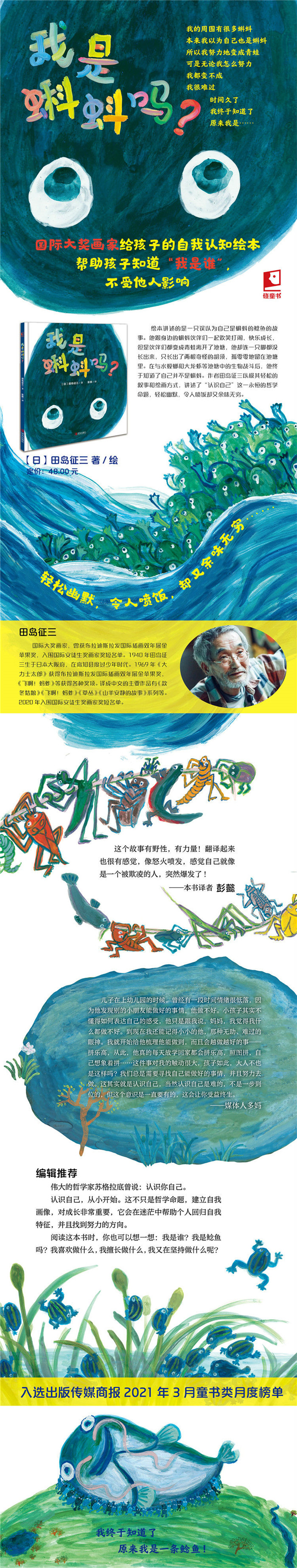 绘本讲述的是一只误以为自己是蝌蚪的鲶鱼的故事。他跟身边的蝌蚪伙伴们一起欢笑打闹,快乐成长,但是伙伴们都变成青蛙离开了池塘,他却连一只脚都没长出来,只长出了两根奇怪的胡须,孤零零地留在池塘里。在与水螳螂和大龙虾等池塘中的生物战斗后,他终于知道了自己并不是蝌蚪。作者田岛征三以极其轻松的叙事和绘画方式,讲述了“认识自己”这一永恒的哲学命题,轻松幽默,令人喷饭却又余味无穷。