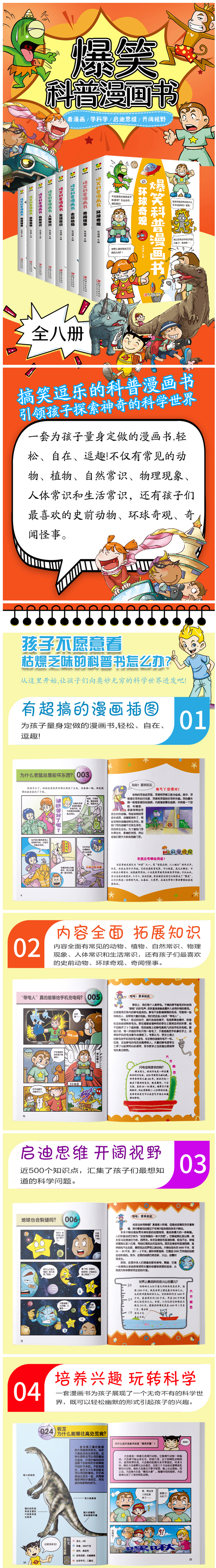 一套为孩子量身定做的漫画书,轻松、自在、逗趣!不仅有常见的动物,植物、自然常识,物理现象,人体常识和生活常识,还有孩子们最喜欢的史前动物,环球奇观,奇闻怪事。