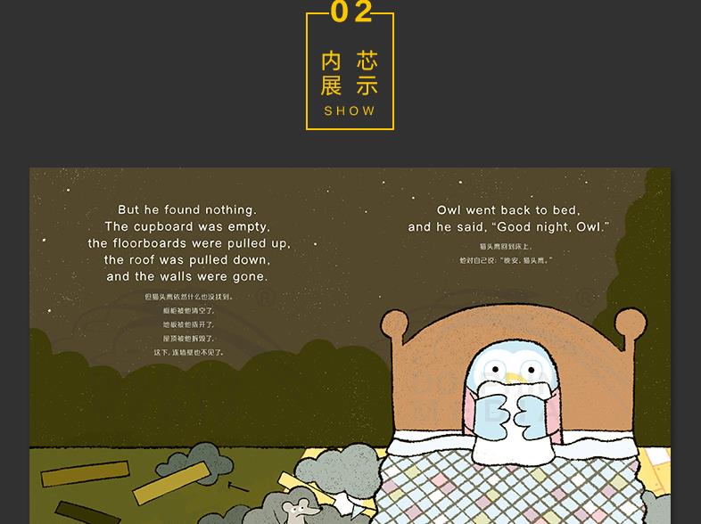 《HOME SWEET HOME双语合辑》共2册,由迪士尼出品,配套资源包括英语音频扫读及宣传动画短片。两本绘本都是以”家和家人“为主题,告诉孩子家需要耐心和包容。故事幽默搞笑,图画风格生动简洁,采用4种专色印刷和绢印艺术,别具一格。《晚安,猫头鹰》获得2017年苏斯·盖泽尔奖银奖,该奖项专门颁发给对儿童英语学习有帮助的童书。