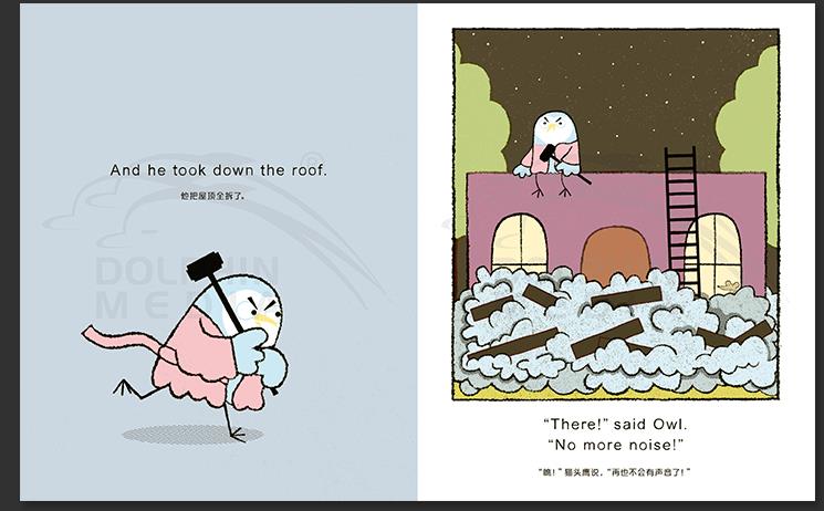 猫头鹰准备睡觉了,他对自己说:“晚安,猫头鹰(good night,owl)!”但每次他刚刚闭上眼睛,就听到房间里奇怪的叫声:squeek!猫头鹰睁开眼睛,在房间里找那个声音的来源。猫头鹰把橱柜、书架、地板统统都翻了个遍,他能找出那个奇怪的声音,然后安心睡觉吗?……猫头鹰将永远不会睡觉,除非他能搞清楚这是怎么回事!也许,一句温柔的由此及彼的“晚安”是让大家都能享受安稳夜晚的魔法……