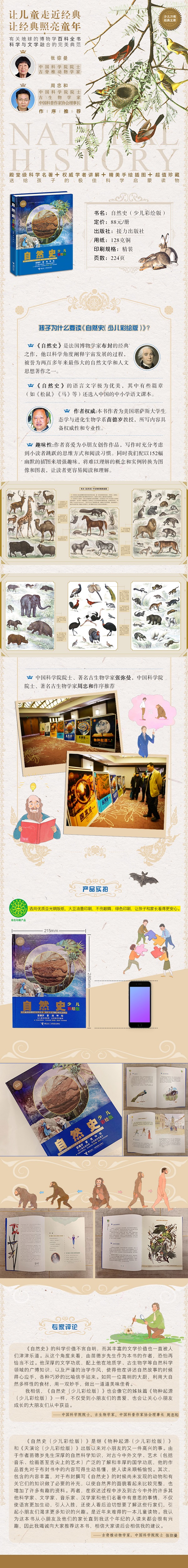 只有布封给自然情感赋予了全部深刻的含义,将它变成了一种哲学情感。——《法国文学史》 布封拥有他的世纪*美丽的文笔。——法国思想家 卢梭 现代以科学眼光对待这个问题的*人。——达尔文 《自然史》的科学价值不言自明,而其丰富的文学价值也一直被人们津津乐道。从这个角度来看,由苗德岁先生作为本书的作者,恐怕再恰当不过。他深厚的文学功底,配上他在地质学、古生物学等自然科学领域的广博知识,以及严谨的治学作风,使得他在讲述自然故事的时候得心应手,各种巧妙的比喻信手拈来。如同一位高明的大厨,利用大自然多样性的食材,用一双妙手,做出一道道美味佳肴。我相信,《自然史(少儿彩绘版)》也会像它的姊妹篇《物种起源(少儿彩绘版)》一样,不仅受到小朋友们的喜爱,也会让关心小朋友成长的大朋友们从中获益。——中国科学院院士、古生物学家、中国科普作家协会理事长 周忠和 《自然史(少儿彩绘版)》是继《物种起源(少儿彩绘版)》和《天演论(少儿彩绘版)》出版以来对小朋友的又一件高兴的事。由于作者苗德岁先生深厚的自然科学知识,对古今中外文学、艺术(包括音乐、绘画甚至舌尖上的艺术)广泛的了解和丰厚的国学功底,他的作品首先对于布封书中的内容写得生动易懂,使人读来顺畅愉悦。其次,包含的内容丰富,对于布封撰写《自然史》的时候尚未发现的动物和有关它们的知识做了必要的补充,以使自然界的面貌看起来比较完整,也增加了许多有趣的资料。再者,在叙述过程中涉及到古今中外的许多其他科学家、文学家、音乐家、汉学家和他们名著中有意思的事情,不仅使语言更加生动,引人入胜,还使人看后迫切想要了解这些行家们,引起小朋友们渴求更多知识的兴趣。是近年来难得的一本儿童读物。我认为这本书从小朋友及他们的家长直到我这个年纪的人读来都会很有兴趣,因此我竭诚向大家推荐这本书,相信大家读后会相信我的建议。——古脊椎动物学家,中国科学院院士 张弥曼