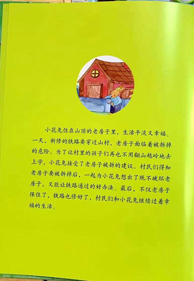 小花兔住在山顶的老房子里,生活平淡又幸福。一天,新修的铁路要穿过山村,老房子面临着被拆掉的危险。为了让村里的孩子们再也不用翻山越岭地去上学,小花兔接受了老房子被拆的建议。村民们得知老房子要被拆掉后,一起为小花兔想出了既不破环老房子,又能让铁路通过的好办法。最后,不仅老房子保住了,铁路也修好了,村民们和小花兔继续过着幸福的生活。