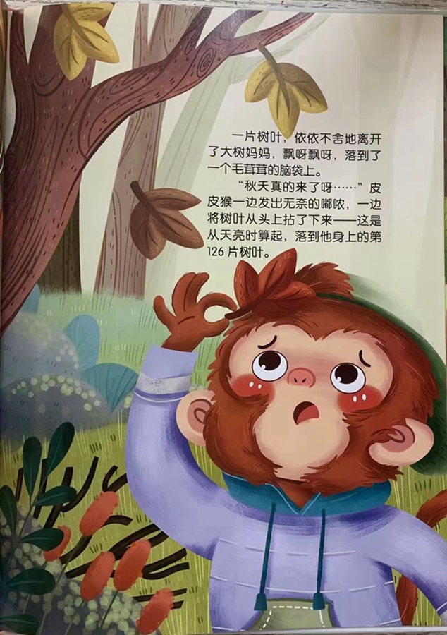 一片树叶,依依不舍地离开了大树妈妈,飘呀飘呀,落到了一个毛茸茸的脑袋上。