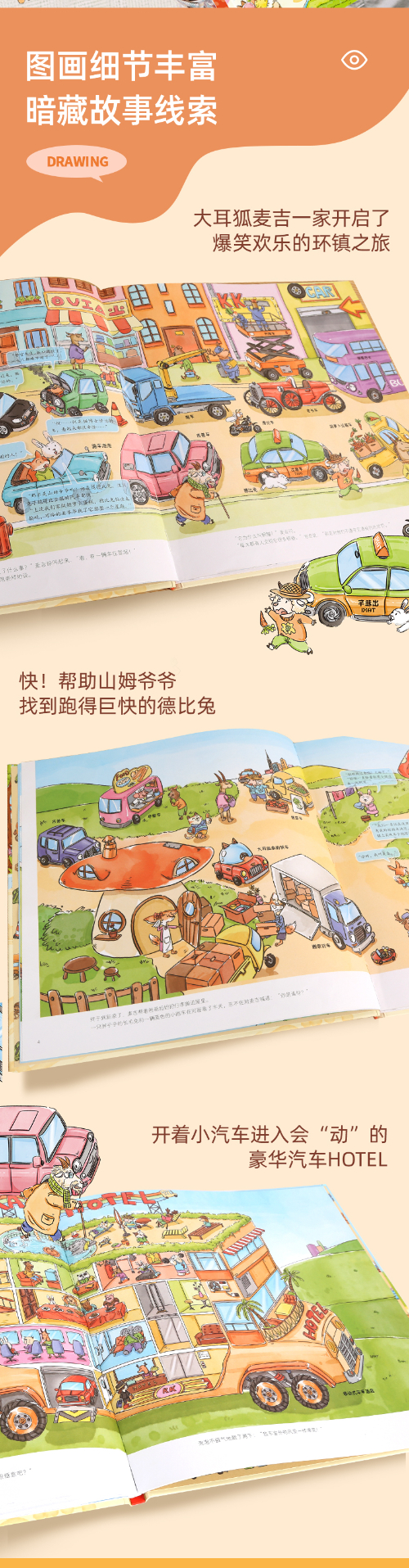 滴滴滴!清早大耳狐麦吉一家开着小轿车搬到汽车镇,这是一个非常热闹的小镇,有着各式各样的汽车,他们形态多样,有表情、会说话、还会像人一样口渴生病,车迷麦吉开心坏了,在新朋友胖墩和汽车泡泡的带领下参观汽车镇。汽车们忙忙碌碌各司其职,长条状的香肠车、可爱的鸡蛋车、螃蟹车……萌趣的画风和故事带你轻松加入麦吉的汽车镇之旅,认识更多的汽车新朋友!