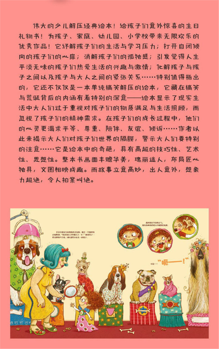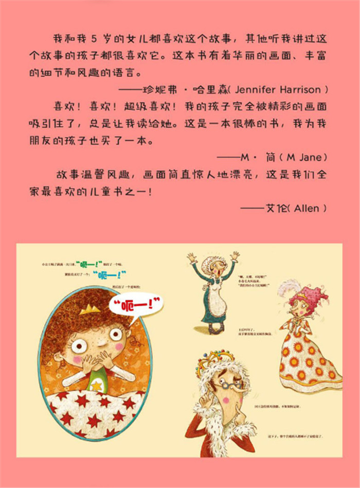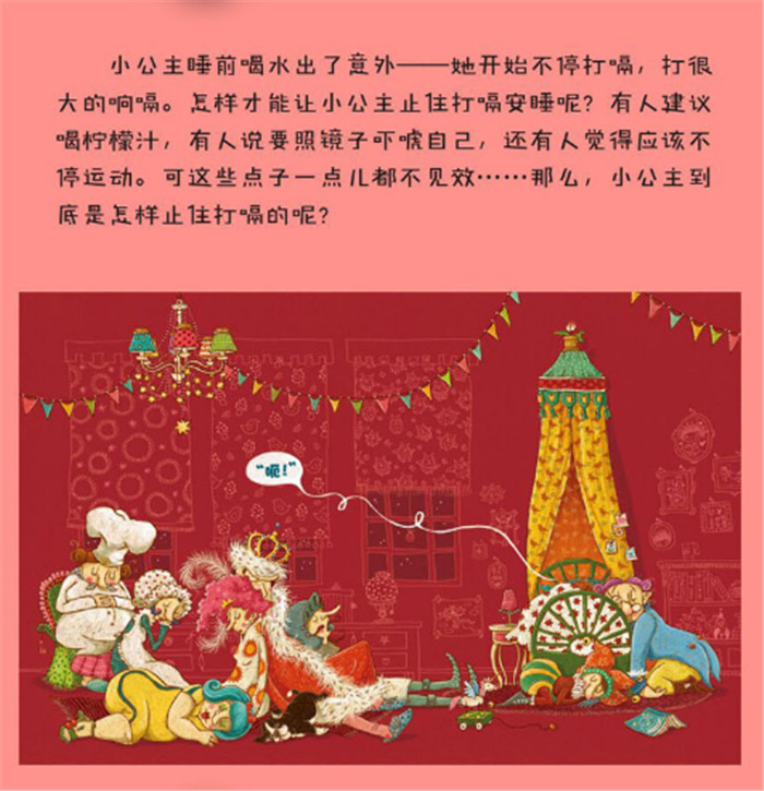 和《放屁小王子》一样,《打嗝小公主》也是从头到尾让人笑个不停。虽然小公主美丽高贵,却也有无奈的事情——睡前喝水噎着了,开始不停地打嗝儿,打很大的响嗝。要怎样才能让小公主止住打嗝安睡呢?整个故事高潮迭起,一波又一波,演出一出可爱、滑稽、幽默的温馨轻喜剧。作品让孩子们在快乐中体会亲友们的爱、关怀、情趣,学会礼貌、生活规范。可以说,它是睡前读物里快乐、有趣的一本书。