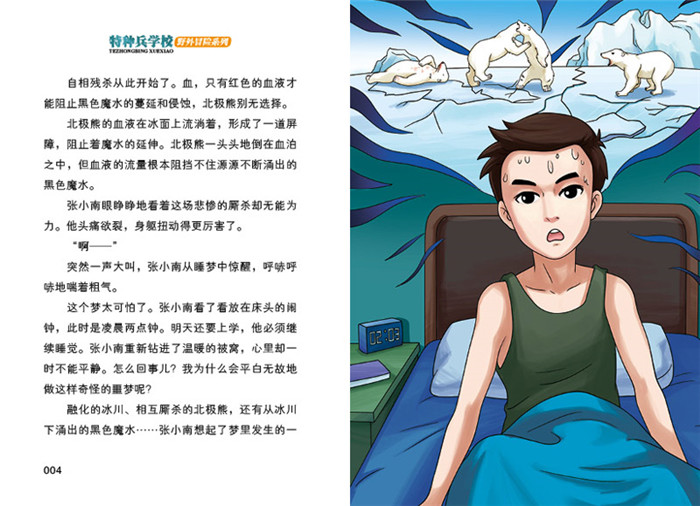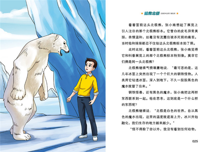 张小南做了一个怪梦。在梦里,一头北极熊对他说:“只有你才能拯救北极!”随后他看见黑色液体从北极冰川下源源不断地涌出;北极熊互相残杀……发生了一系列稀奇古怪的事。这一切让张小南下定决心要到北极一探究竟。一次偶然的机会,小南和小北跟随当特种兵的老爸一起来到北极。在那里,他梦中见到的事情一一发生。*终,他们尽全力保卫了濒临险境的北极。