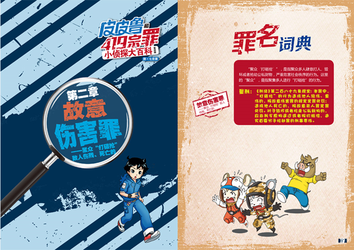《皮皮鲁和419宗罪小侦探大百科》系列丛书为孩子们准备了有趣的法律知识,每一章十个栏目,想象十足、趣味十足的为孩子们讲解法律知识。孩子们通过漫画故事,生动的了解犯罪的心理和过程;通过阅读百科栏目,了解法律常识;舌战即辩论让孩子们学会从不同的角度思考问题;大法官则是为孩子们量身定制的模拟法庭,让孩子们自己当法官,判断是非对错;有趣的侦探游戏还可以锻炼孩子们的逻辑推理思维,给孩子们带来快乐而真实的体验。