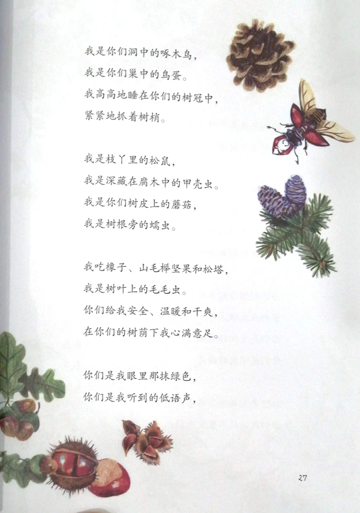 本书画面令人惊艳。绘者把浓厚的绿与鲜艳的红、黄、橙等色彩交结在一起,鲜活地表现出来森林的厚重和丰富,以及生机勃勃的美景。然而,这种色彩现在正在从我们的身边消散。怎样能唤起人们对自然的关爱,唤起人们保护自然环境的强烈情感,这正是本书想做的。本书通过一个森林化身的小精灵与女孩内米的互动,讲述了森林的漫长、不易,森林对各种生物的重要性,如蝴蝶、鸟、虫虫……以及森林对人类重要的生活作用等。通过小精灵与伐木工的冲突,表现了人类对森林、自然的伤害。随着女孩与森林精灵的互动深入,我们好像听到了森林的呻吟、大自然的呼喊,在这种情绪中,还有什么比“保护森林、保护自然,保护我们天然的家园”更重要的呢!