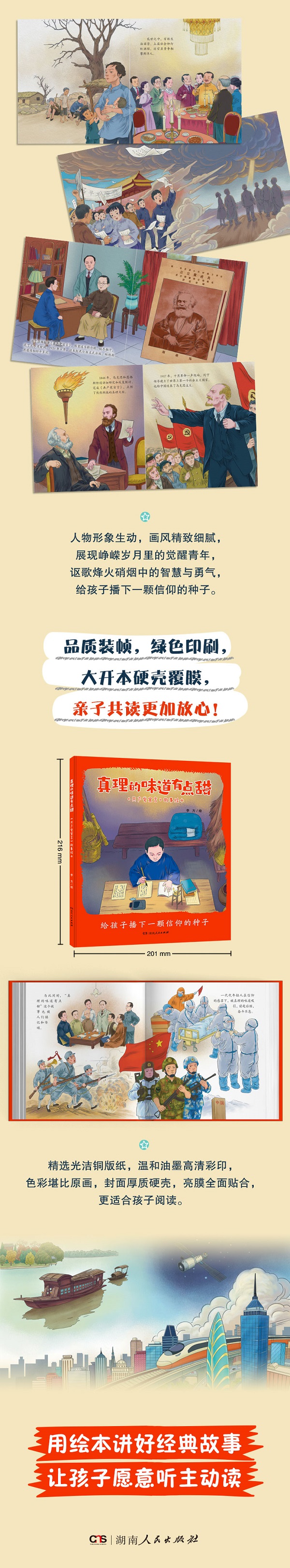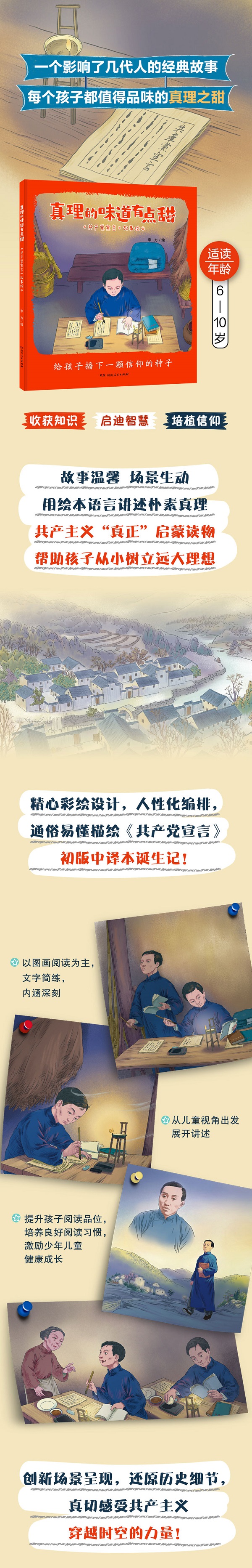 “真理的味道”故事具象化,生动描绘《共产党宣言》初版中文全译本诞生过程。 画风精致细腻,生动有趣,彰显共产主义穿越时空的强大力量,给孩子播下一颗信仰的种子。 精选光洁铜版纸,温和油墨高清彩印,大开本硬壳精装,封面亮膜贴合,更适合亲子共读。
