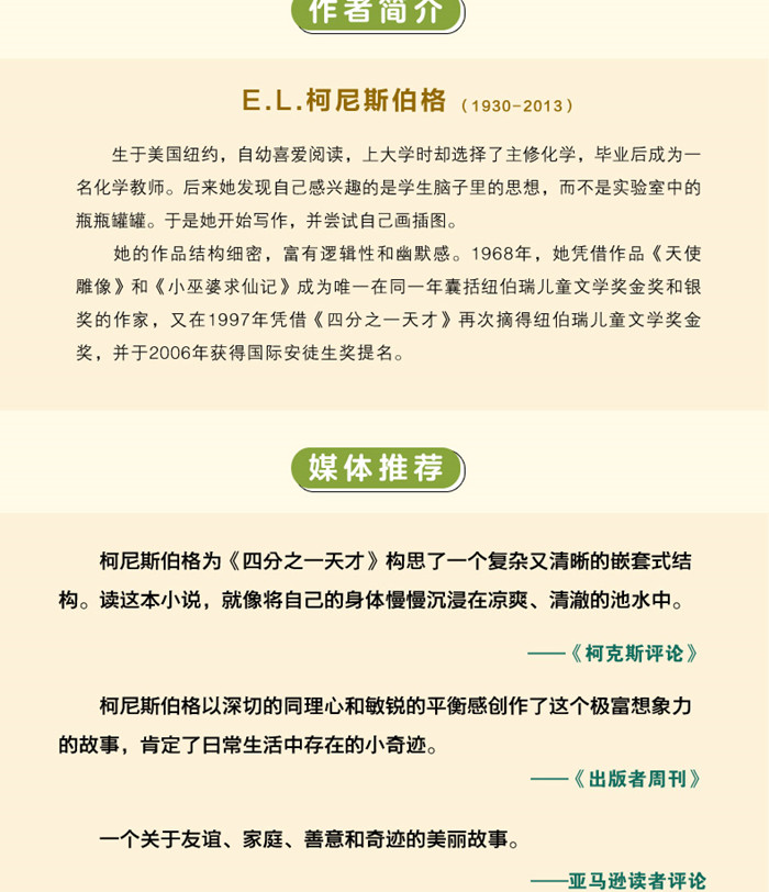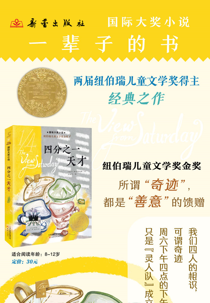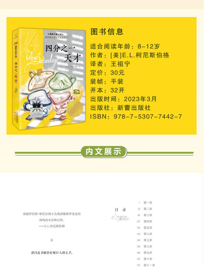 1.1997年纽伯瑞儿童文学奖金奖作品,是一个讲述关于友谊、责任、善意、诚信、接纳等主题,阐释勇往直前、精诚合作的团队精神的经典故事。 2.作家熟谙成长期孩子的心理经验,真实再现个性迥异的四个孩子复杂的心理轨迹,让主人公直面成长过程中的惊喜和痛苦。 3.作品聚焦孩子成长中的“自我意识、个性、身份问题”,是一部真正能帮助少年读者成长的作品。 4.复杂又清晰的嵌套式结构,在核心事件的叙述中和谐穿插四个主人公的故事,巧妙呈现人物之间错综有趣的关系。