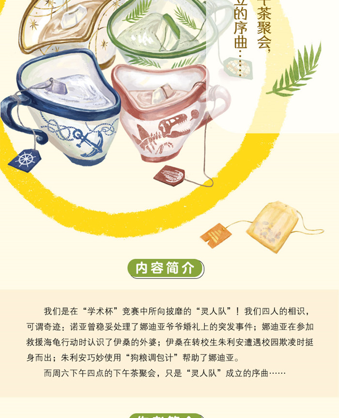 我们是在“学术杯”竞赛中所向披靡的“灵人队”!我们四人的相识,可谓奇迹:诺亚曾稳妥处理了娜迪亚爷爷婚礼上的突发事件;娜迪亚在参加救援海龟行动时认识了伊桑的外婆;伊桑在转校生朱利安遭遇校园欺凌时挺身而出;朱利安巧妙使用“狗粮调包计”帮助了娜迪亚。 而周六下午四点的下午茶聚会,只是“灵人队”成立的序曲……