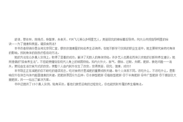 她的方法在众多真人实例上,取得了显着的成功,解决了无数人的身体烦恼。许多艺人也慕名而来以求她的诊断和养生建议。她所提倡的“择食养生法”,不但能使缠绕在现代人身上的顽固烦恼,如内火外火、胀气、便秘、过敏、失眠、肥胖、衰老问题一一消失,更经由生活饮食方式的改变,使整个人由内到外发生了改变,变得美丽、窈窕、健康、成功!