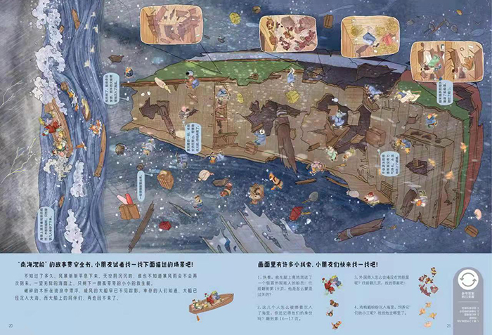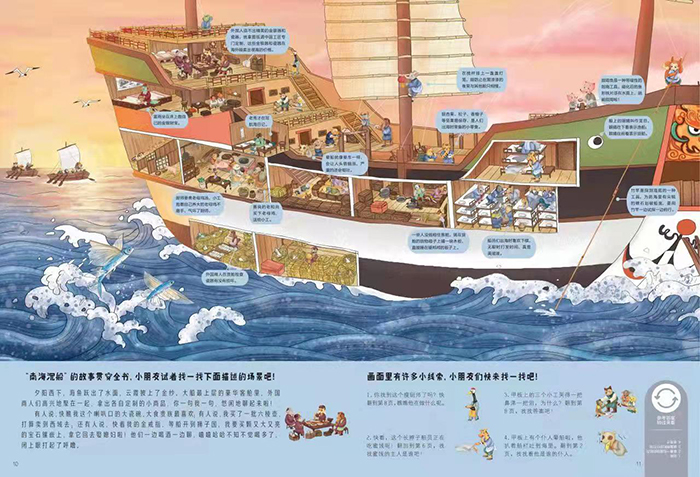 《南海沉船》通过外国商人租赁中国商船做生意这条主线,穿插抗击海贼、宝物破损、僧人施救、修理船舱等支线线索,展现了海上贸易的惊险与刺激。全套书故事线索编排精巧,画面精美,勾勒出一幅唐宋的历史风情画卷。因此,这是一部小朋友需要反复翻看、专心解读的趣味作品。