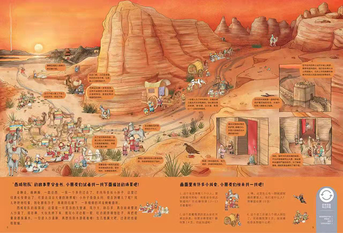 其中《西域驼队》单册拥有30多条故事线索,笑料不断,其中主线索是来自西域的一支骆驼商队通过丝绸之路,来到古代中国做买卖,带来了一路上新鲜的见闻和故事。支线线索包括乐团表演、公主和亲、使团出关、犯人逃跑、将士戍边、僧侣取经等众多头绪,层叠交叉,互相呼应。