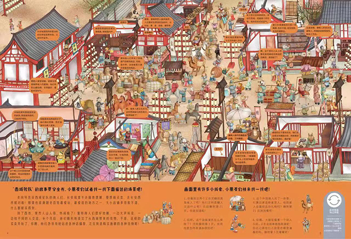 这是一部关于古代中国“丝绸之路”的全景式游戏线索书。全套共两册,以全景画面展现唐代都城长安、西域,宋代泉州城等丝绸之路起点和沿线的景象,将历史知识隐藏于画面之中,展现了古代经济、文化的空前繁荣,并且通过游戏的方式让小读者在各个丰富的场景中寻找线索,发现知识的乐趣!
