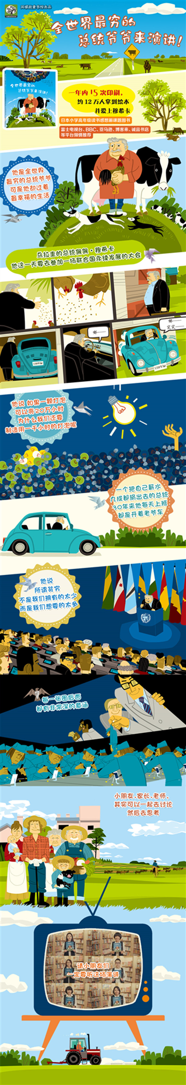 2012年在巴西的里约热内卢召开了一次国际会议,这次会议的主题是地球环境恶化和人类社会的可持续发展。来自世界各国的代表轮番发言,轮到南美国家乌拉圭总统穆希卡登台演讲了。穆希卡总统身穿西装,不过并没有系领带。这位总统把自己的一大半收入都捐给了贫苦的国民,他不住总统官邸,而是和夫人住在离市区很远的农场里。乌拉圭人民亲切地称呼他们的总统为“佩佩”。 “我们追求更加方便和富裕的生活,可是我们幸福吗? ” 世界上zui穷总统的演讲直抵人心。