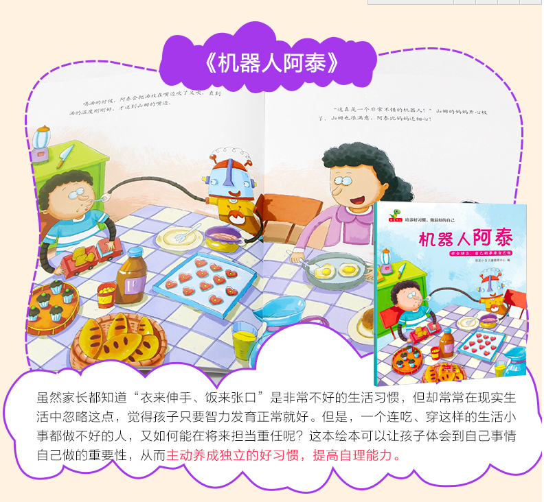虽然家长都知道“衣来伸手、饭来张口”是非常不好的生活习惯,但却常常在现实生活中忽略这点,觉得孩子只要智力发育正常就好。但是,一个连吃、穿这样的生活小事都做不好的人,又如何能在将来担当重任呢?这本绘本可以让孩子体会到自己事情自己做的重要性,从而主动养成独立的好习惯,提高自理能力。