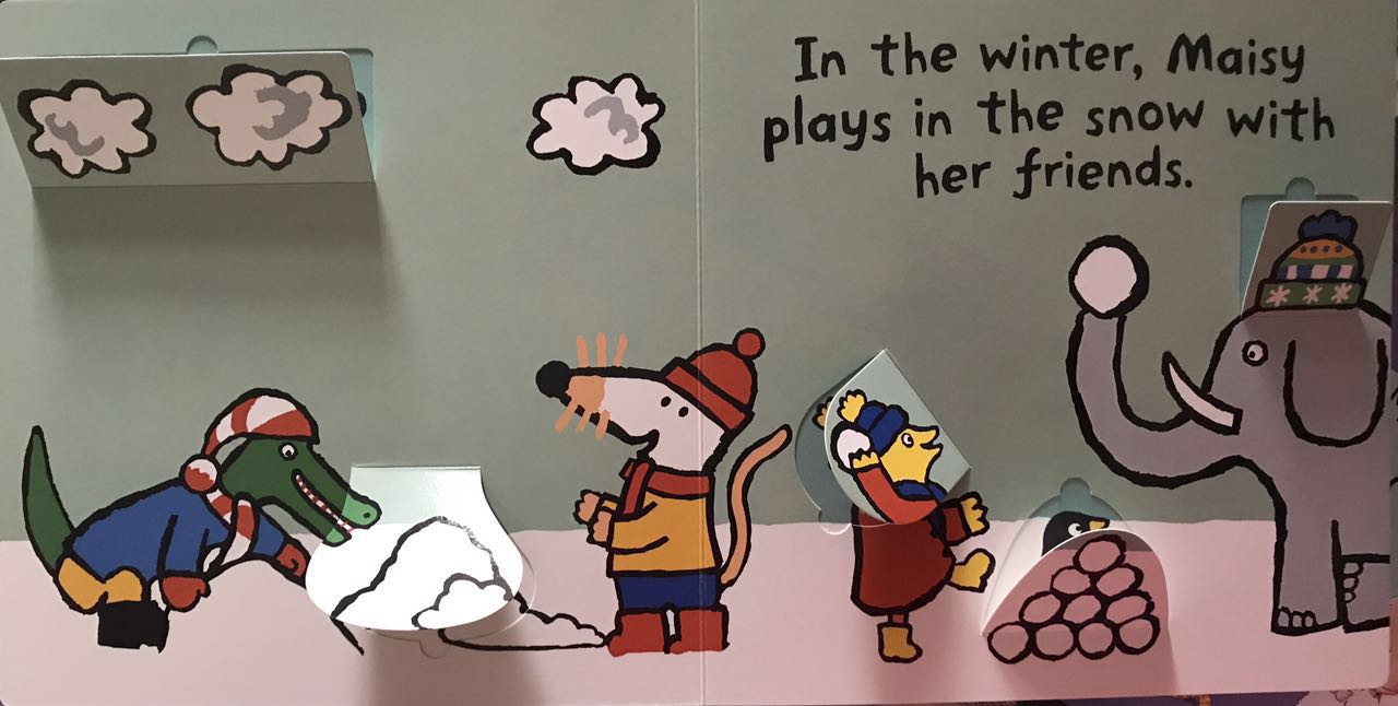 Maisy is ready for any kind of weather in this big new spin-the-wheel, lift-the-flap book Spring, summer, winter, fall - is there a season when Maisy doesn't have fun? In this big, bright board book, the spirited mouse and her friends feed the lambs in the spring, play on the beach in the summer, gather the harvest in the fall, and play happily in the winter snow. Meanwhile, her many fans can peek behind windows and clouds and - best of all - turn the wheels to make hidden objects appear along with the words that name them. A whole new way to be crazy for Maisy