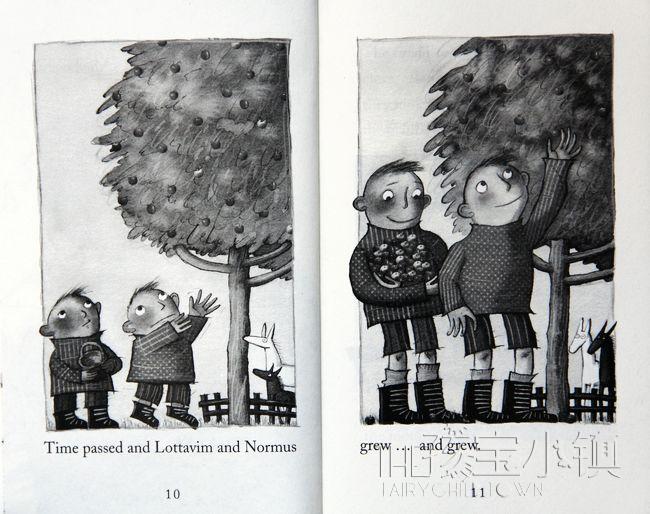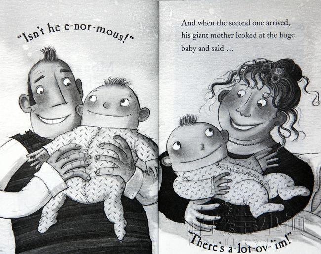 "Isn’t he e-nor-mous!" says the giant father when his first twin son is born. "There’s a-lot-uv-’im!" notes the giant mother when the second twin boy arrives. And as Normus (a vegetarian) and Lottavim (a carnivore) grow and grow, the two are hugely happy — playing Roll the Boulder, singing badly, and doing everything together. But when the day comes for the hulking lads to seek the giantesses of their dreams, will going their separate ways only lead them into double trouble?