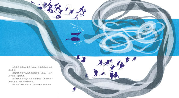 胖子家住河东,瘦子家住河西。他们是一对冤家,因为小事起了争执,他们不让自己的孩子与对方的孩子玩,孩子们也不让自己的狗和对方的狗玩。一直僵持着。直到某天早晨,两家人在烧早饭,河东这家用的是湿柴,从烟囱里飘出的是黑烟,河西这家用的是干柴,从烟囱里飘出的是白烟。黑烟白烟,轻轻盈盈地飘到了天上,它们先是自由自在地飘了一会儿,很快,都向对方飘了过去……