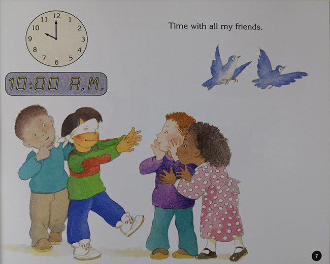 Pre School-Grade 3-In Time, a simple text and colorful cartoon artwork show a child as he goes through a typical day, with activities listed for each hour. Times are presented on both a digital and round-faced clock. Unfortunately, the digital numbers are in yellow on a purple background, making them hard to read.Also, although the narrative mentions "time to learn" or "quiet time," the exact hour (e.g., five o'clock) is never written out in the text. Claire Llewellyn's My First Book of Time (DK ...