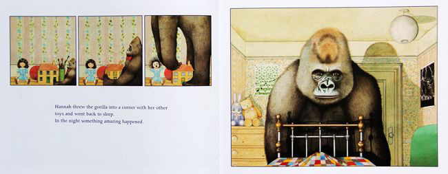 《Gorilla》一经出版,就一举荣获多项重要大奖,并且将作者安东尼·布朗推进图画书创作者之林,成为布朗经典而重要的代表作。书中,布朗利用 “父亲”和“大猩猩”的共同点——高大威武却亲切温和,描绘了一个忙忙碌碌、不擅表达,却用行动来体现伟大的父爱的感人故事。也细致地刻画了孩子心中,孤独害怕,渴望父亲所给予安全感的心理。大猩猩的梦幻形象之出现,更是使孩子产生强烈的认同感。随着大猩猩成为深受孩子喜爱的形象,《Gorilla》也成为历经时间验证而经典的童书绘本。