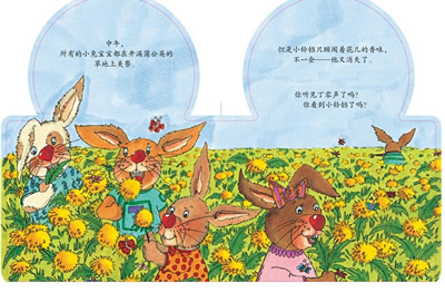 ? 每页中小宝宝都要配合故事内容摇摇发声的毛绒耳朵或帽子,找找藏在图画里的小主人公,锻炼孩子的观察寻找能力,也培养了孩子的注意力。