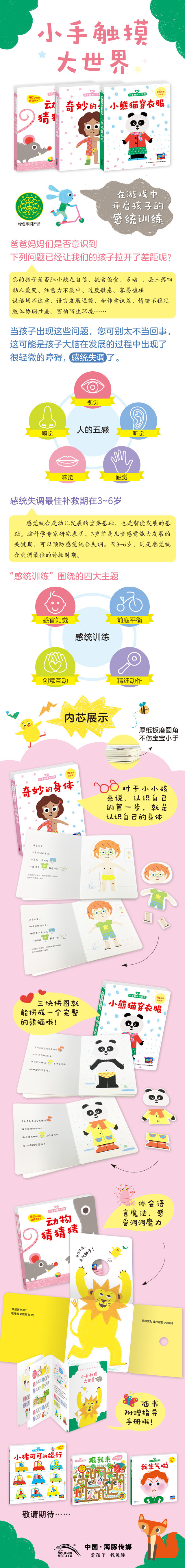 《小手触摸大世界·第一辑》是一套鼓励2-4岁孩子伸出小手,走出自己的小天地,大胆探索世界的互动游戏绘本。它通过让孩子抠洞洞、拼装各种规格的身体拼图、打开大翻翻页等多种游戏形式,全面刺激宝宝前庭、肌肉、关节、皮肤触摸、视、听等感觉,帮助宝宝建立自信,让宝宝在游戏中感受快乐,获取更多的外界信息。
