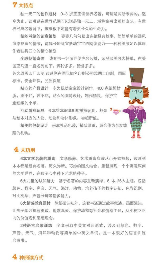 ·精妙叫绝的创意策划, 寥寥几句勾勒出完整经典故事,简简单单的画风渲染复杂的情节,篇幅长短适宜低幼宝宝的阅读能力——种种细节足以体现作者独具匠心的精心策划