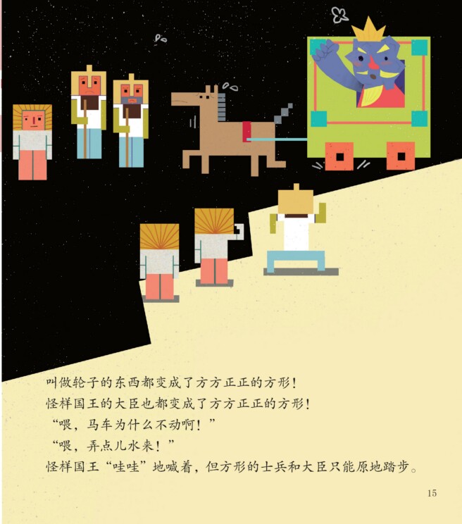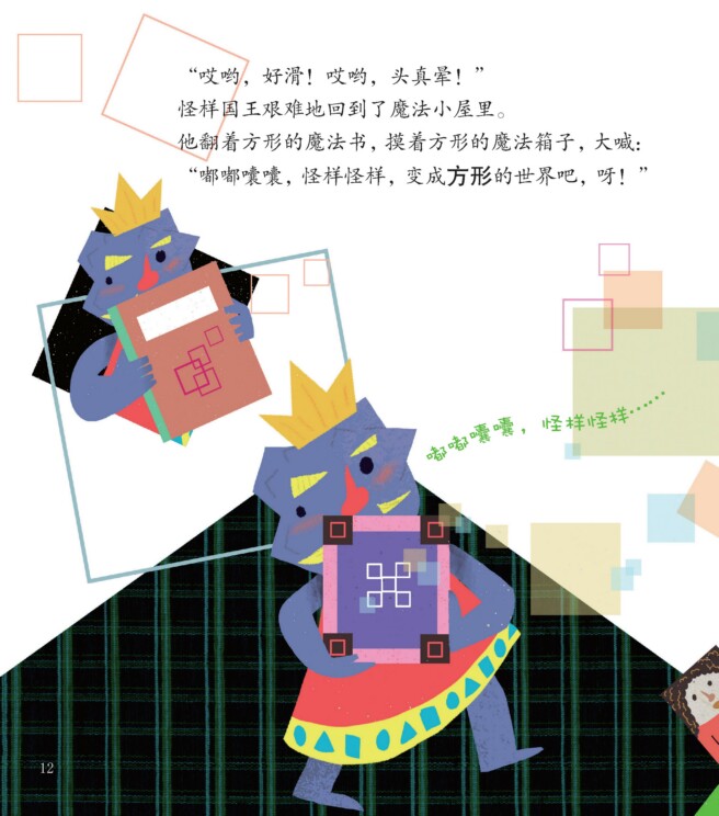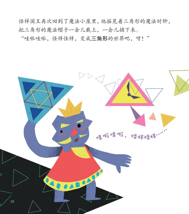 在遥远的图形星王国里,有一个怪脾气的国王。国王每次生气时,都会念起咒语,让整个王国的东西都变成同样的形状:都变成三角形!都变成圆形!都变成方形!这下,王国里可乱七八糟啦!