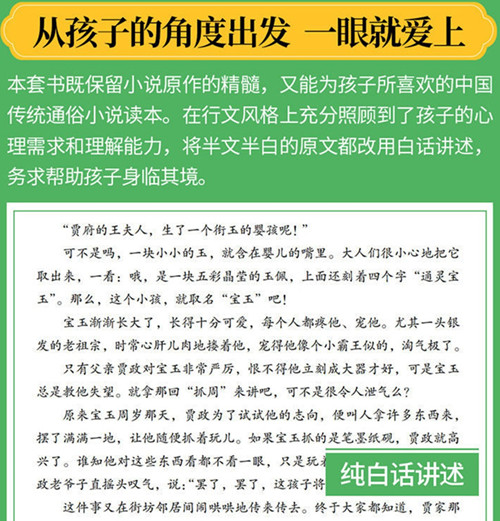曹雪芹(1715-1763),(也有说法为生于1724年,或卒于1764年),满洲人,名霑(读作“zhān”),字梦阮,又号雪芹、芹圃、芹溪等,祖籍河北唐山(一说辽宁铁岭,一说辽宁辽阳),中国清代文学小说家、诗人、画家。他出身于“百年望族”的封建官僚大家庭,后因家庭衰败而饱尝人生辛酸。他以坚韧不拔的毅力,前后花了十年时间,经五次增删,创作了《红楼梦》。因部分稿件被借阅者遗失,他死后仅遗留下前八十回的稿子,经后人续写,高鹗整理,才形成了如今的一百二十回《红楼梦》。《红楼梦》规模宏大,结构严谨,情节复杂,描写生动,塑造了众多具有典型性格的艺术形象,堪称中国古代长篇小说的高峰,在文学发展史上占有十分重要的地位。 目录: 衔玉出生的孩子 相看两不厌 闪闪发光的金锁片 梦游太虚幻境 宝玉和秦钟 茗烟大闹学堂 一哀一喜 元妃娘娘与大观园 耗子精的故事 黛玉葬花 金钏儿事件 藕香榭里的诗会 刘姥姥游大观园 香菱学诗 紫鹃戏弄宝玉 潇湘妃子的噩梦 通灵宝玉不见了 谁是新娘子 雪中的离别