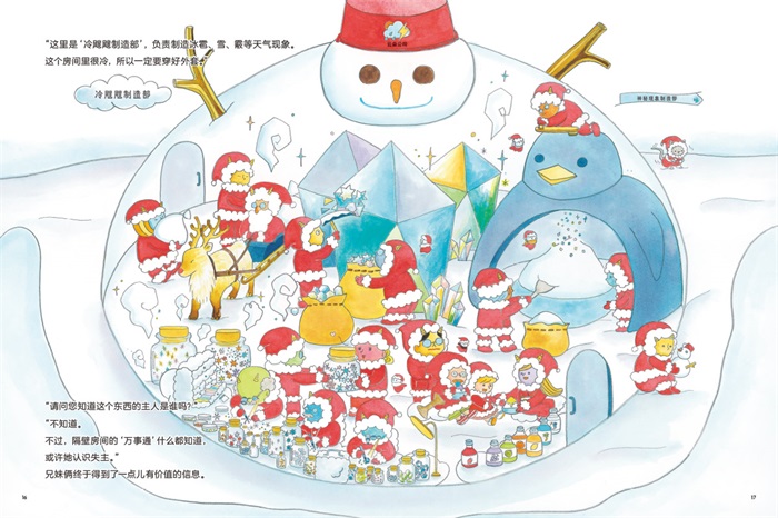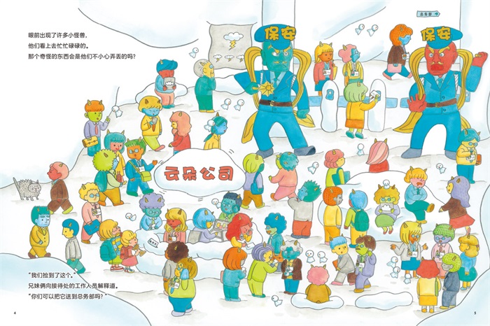 全书构思巧妙,以寻找失主为主线,引领孩子们参观一家天空中制造天气现象的公司,全书在尊重客观事实的同时充满了奇思妙想。对公司职能和天气现象形成过程的讲解简明扼要,既交代清楚了基本的知识,又符合学龄前儿童的认知水平。配图色彩明快,细节丰富。