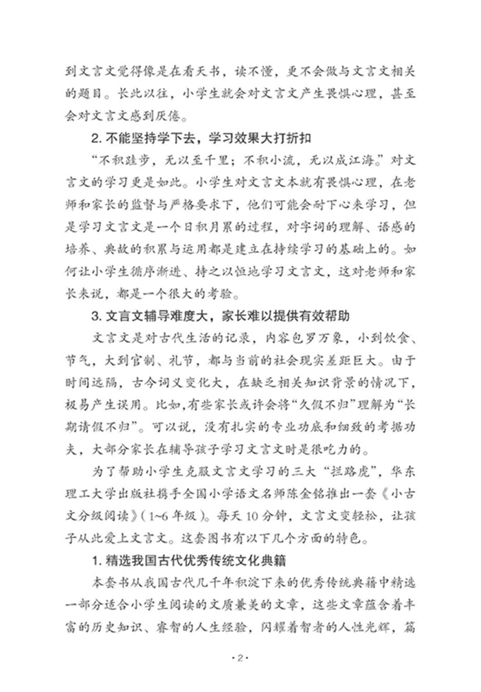 科学分级——依据小学生的接受能力和语言发展水平科学分级 选文经典——精选我国古代六部优秀传统文化典籍的经典片段 名师编写——多名教授领衔和名师参与的专业资深的编写团队 故事激趣——在阅读故事的过程中自然习得文言文学习的方法 讲练结合——课后设置学生喜闻乐见的练习题来检测所学内容