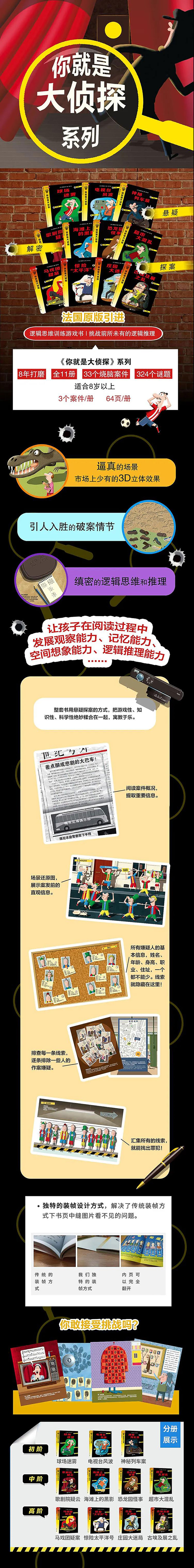 海滩度假营地发生了三起神秘的案件。每个案件都有11位嫌疑人,通过10条线索逐一分析,*后都能锁定罪犯。在分析线索的过程中,提高小读者的逻辑推理能力,拓展演绎和归纳能力。适合8-12岁的儿童阅读。 全套一共11册,33个高难度案件,逐个抽丝剥茧,带给孩子不一样的推理和思考方式!