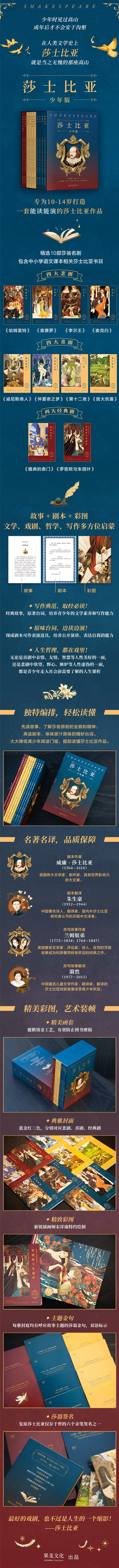 《莎士比亚(少年版)》是一套专为10-14岁青少年打造的莎士比亚作品入门读物,精选了影响世界四百年的10部莎士比亚经典名剧,包含四大悲剧《哈姆雷特》《奥赛罗》《李尔王》《麦克白》,四大喜剧《威尼斯商人》《仲夏夜之梦》《第十二夜》《皆大欢喜》,还有两部经典剧《罗密欧与朱丽叶》《雅典的泰门》。采用戏剧故事 剧本节选的独特编排方式,让青少年读者能够提前进入伟大的莎士比亚作品世界,打开戏剧、文学和想象力的大门,提升文学素养和写作能力,领悟人生哲学和为人处世的道理。 全套图书共有十册: 《哈姆雷特》以命运为主题,通过“丹麦王子哈姆雷特向篡位的叔叔复仇的故事”,讲述了命运的变幻无常——生存或毁灭,是每个人都要考虑的问题。 《奥赛罗》以嫉妒为主题,通过“威尼斯将军奥赛罗因嫉妒毁掉整个人生的悲剧故事”,讲述了嫉妒的危险性——嫉妒是个狡猾的妖魔,一旦成为它的猎物,就要付出沉重的代价。