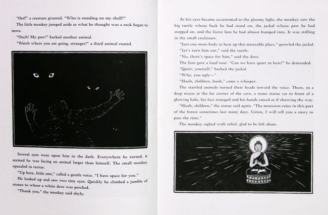 A colorful introduction to Buddhist fables A monkey, caught in a monsoon, finds shelter in a cave amid the rubble of a temple. The monkey is not alone. A lion, a jackal, a turtle, and a dove bicker in the cramped space, until a statue of Buddha comes to life. "Hush, children, hush." Buddha says. "I will tell you a story to pass the time." From the tale of the clever monkey outwidding a hungry crocodile to that of a bird and turtle rescuing a friend, the six amusing parables told by the Buddha will introduce young readers to the famous cycle of fables in Buddhist literature known as the Jatakas, or birth stories, which Buddha originally told to his disciples to illustrate his teachings. Joined with stunning linocut illustrations, Jeanne M. Lee's retellings form a book notable for both its beauty and its wisdom.