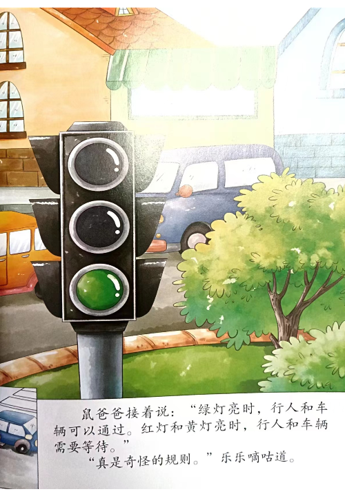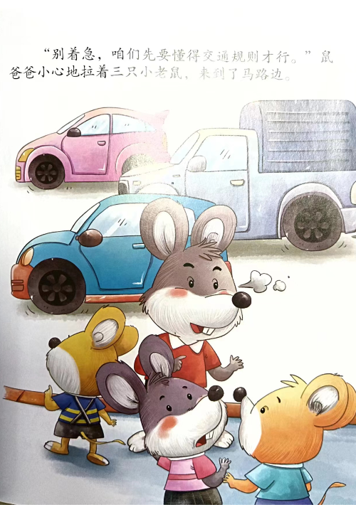 鼠爸爸带着小老鼠大大、奇奇和乐乐出门见面,认识了会变色的信号灯。鼠爸爸和小老鼠们过马路时遇到了黑猫的袭击,他们能不能利用交通规则成功逃脱呢?
