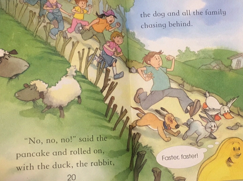 当一个大家庭的7个孩子早餐等着吃煎饼时,不想被吃的煎饼从锅里跳了出来跑到了。他能逃过整个家庭的追捕吗?同时追他的还有小狗、小兔、小鸭等动物。这个故事版本很多,但是最后小饼都是被吃掉了。