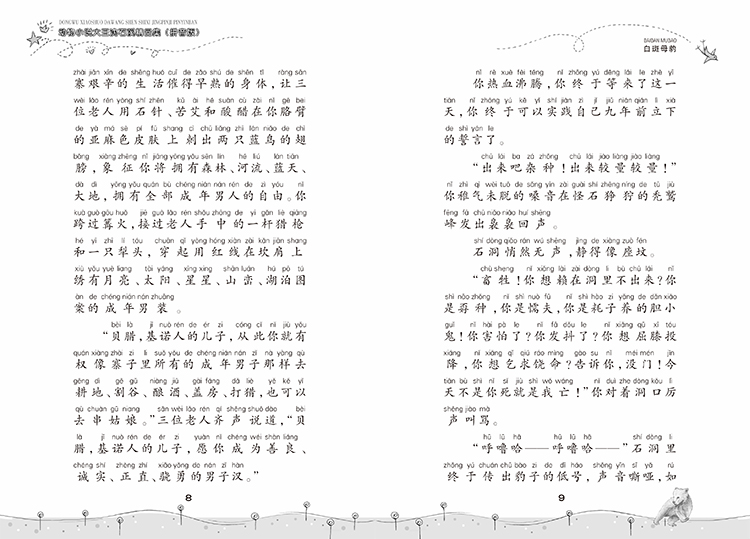 2、《白斑母豹》是“动物小说大王沈石溪精品集(拼音版)”系列其中的一本,收录了《白斑母豹》《大灰狼与小绵羊》《会做生意的狐狸》《棕熊的故事》等四篇文章。这些故事描述了人与动物之间、动物与动物之间的恩怨情仇,穿插了对动物生活习性的描述,对学龄前儿童和低年级儿童都有很深的教育意义。