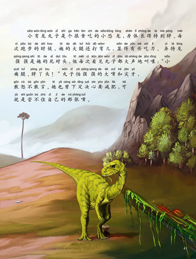 大椎龙夫妇都是找美食的行家,他们一边走一边细细打量树上的叶子,不时把幼嫩的叶子送到宝宝的嘴里。走着走着,爸爸像发现什么宝贝似的,快走了两步,来到一块小石子近前,有些吃力地弯下腰,叼起石子,把它送到大椎龙宝宝的嘴边。大椎龙宝宝正在纳闷儿,听见妈妈喊道:“孩子,快张嘴,这是咱们的消化武器!”来不及问个明白,就张开小嘴,把石子咽到了肚子里。