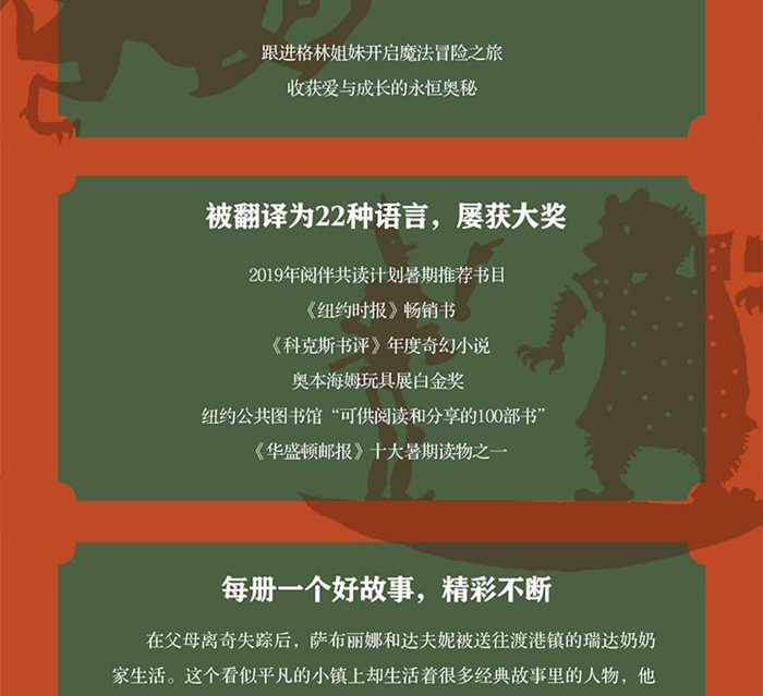屡获大奖,国外媒体好评如潮 连续13周蝉联美国《纽约时报》畅销图书榜 美国《科克斯评论》年度奇幻小说 奥本海姆玩具展白金奖 美国纽约公共图书馆“可供阅读和分享的100部书” 美国《华盛顿邮报》十大暑期读物之一 美国独立书商协会选书 《今日美国》畅销书 被美国*受女性欢迎的杂志之一《简单生活》列为书目