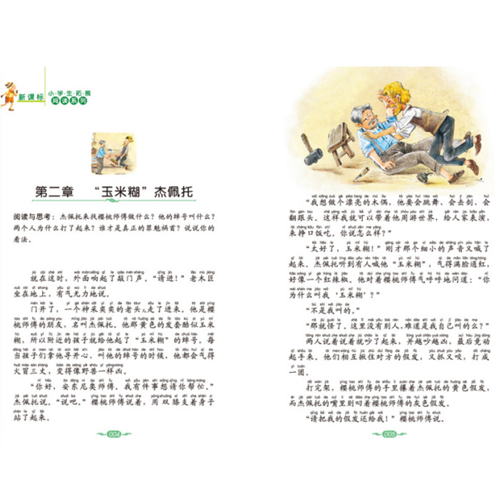 《木偶奇遇记》科洛迪的代表作,发表于1880年。老人皮帕诺把一块能哭会笑的木头雕成木偶,赋予它生命,并将他当成儿子。老人卖掉上衣,供儿子上学。可是小木偶一心贪玩,为了看戏不惜卖掉课本,因贪心而受骗,进了监狱,后来又变成了驴子。*后,他掉进一只大鲸鱼的腹中,意外与皮帕诺相逢……经过这次历险,皮诺曹终于长大了,他变得诚实、勤劳、善良,成为了一个真正的男孩。本书描述了木偶皮诺曹从一个任性、淘气、懒惰、爱说谎、不关心他人、不爱学习、整天只想着玩的小木偶,变成一个懂礼貌、爱学习、勤奋干活、孝敬长辈、关爱他人的好孩子的过程,以及他所经历的一连串的奇遇,充满了童趣与想像。发生于皮诺曹身上的故事告诉我们,孩子的自然天性在许多方面都是需要修正的。也就是说,在自然天性里往往会有不少不够尽善尽美的表现,等待着我们的逐步克服。