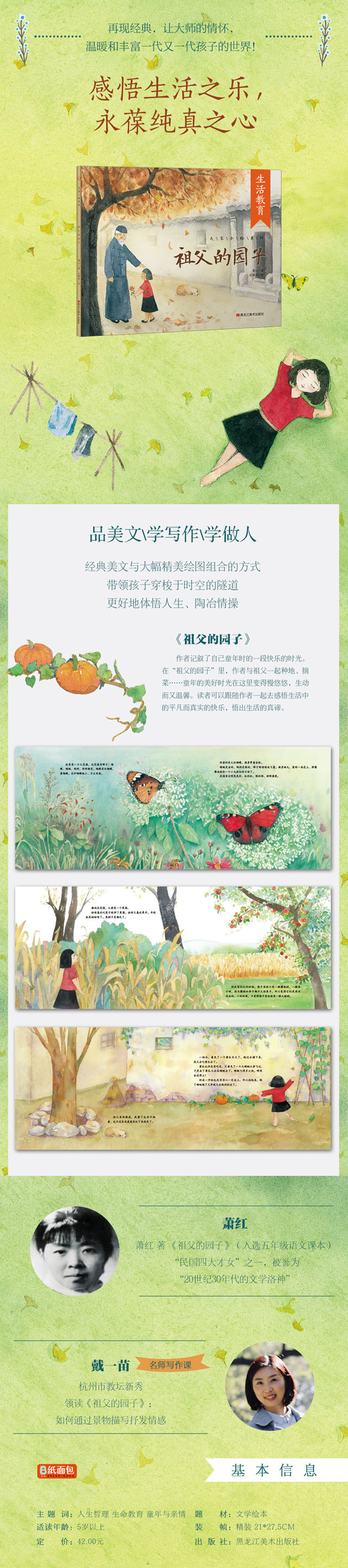 在《祖父的园子》这篇唯美的散文中,作者萧红回忆了童年跟随祖父在园子里“劳动”和玩耍的无拘无束的生活,表现了亲近自然景物,亲近小生命的幸福与快乐,寄托了对故乡的怀念,对自由纯真生活的向往。祖孙情深,跃然纸上,这种深厚、至纯的人间亲情,让小读者能够获得心灵的慰藉,同时也唤醒他们去关爱祖辈、于真情中获取更多的爱的力量和家庭的支持的主动性。