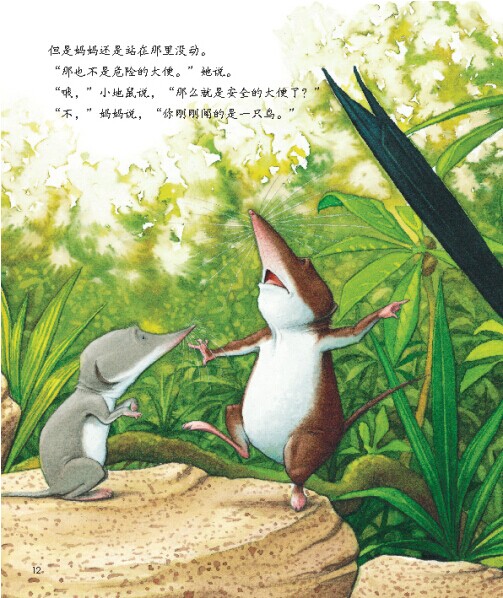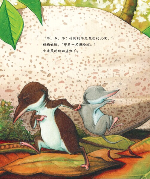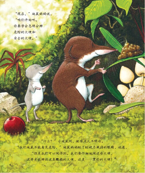 黑豹的大便对小地鼠来说是可怕的大便。如果他们闻到了黑豹的大便,他们一定会发疯似地逃跑,因为小地鼠是黑豹最喜欢的美食。不幸的是,小地鼠无法闻到任何气味——他甚至无法区分蝴蝶和大便。他在又深又黑的丛林里如何生存下去呢?妈妈爸爸为此很担忧,小地鼠也很羞愧、很害怕。但是,当一只安静蠕动的黑豹靠近他的哥哥,哥哥陷入生命危险的时候,小地鼠不假思索地冲过去,吓跑了黑豹。他怎么知道黑豹在哪里?是他那超级敏锐的听觉探测到的,这项超能力远远弥补了他嗅觉的不足!