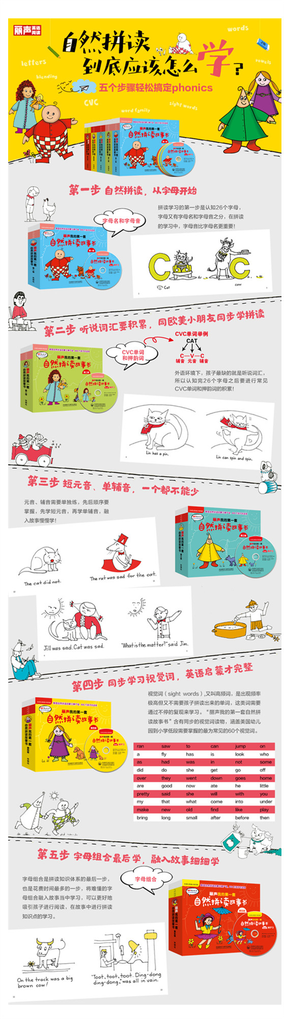 “丽声我的第1套自然拼读故事书”是一套通过有趣的故事进行自然拼读启蒙的英文绘本,在简单易懂的故事中注入自然拼读的启蒙学习。“丽声我的第1套自然拼读故事书”在国外是一套家喻户晓的儿童读物,销量达数百万之多,荣获众多奖项,《华盛顿邮报》《今日美国》等杂志报纸均做过大力推荐,适合对3-10岁的孩子进行自然拼读启蒙使用。“丽声我的第1套自然拼读故事书”共分为5个级别,每个级别含16-22本故事书。